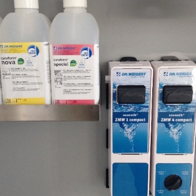 Durch die Installation von Zumischgeräten für die manuellen Produkte in den jeweiligen Arbeitsbereichen konnte die eingesetzte Menge an Reinigungsmitteln reduziert werden. Jetzt steht die jeweils erforderliche Anwendungslösung automatisch zur Verfügung, wodurch eine Über- oder Unterdosierung vermieden wird. Wird ein Reinigerkonzentrat benötigt kann auf einen Kippdosierer zurückgegriffen werden. Zudem lässt sich durch den Einsatz des Desinfektionsreinigers jeweils ein Arbeitsschritt einsparen.